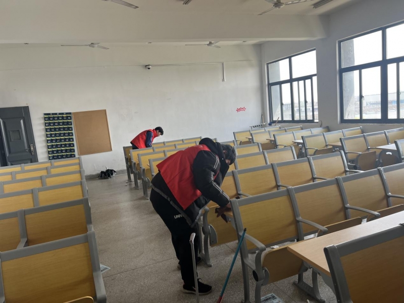 活动当天,志愿者们来到公共教室进行卫生清洁。根据提前做好的分工,志愿者们进行了桌面、讲台清洁以及地面清扫工作,随后进一步清理教室中的卫生死角,如墙角、桌底、窗台等。